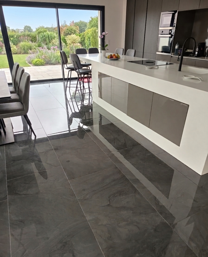 Cuisine ouverte en grès cérame poli grand format Carrelage brillant effet marbre anthracite, pour une cuisine lumineuse et haut de gamme.